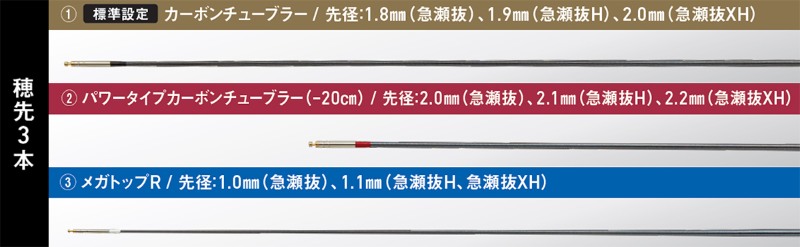 付属のパワータイプ替穂持ちと3本の穂先の組み合わせにより、6通りの鮎竿に変化するのが特徴です。