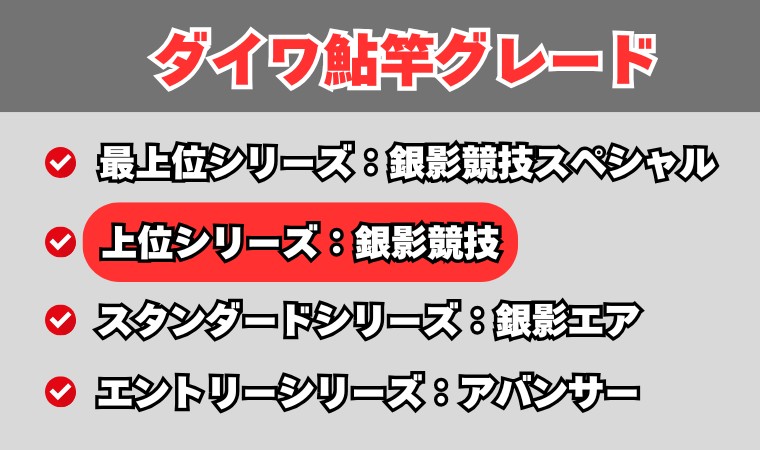 ダイワの「銀影競技 A」は、軽量胴調子タイプとして位置づけられている上位モデルです。